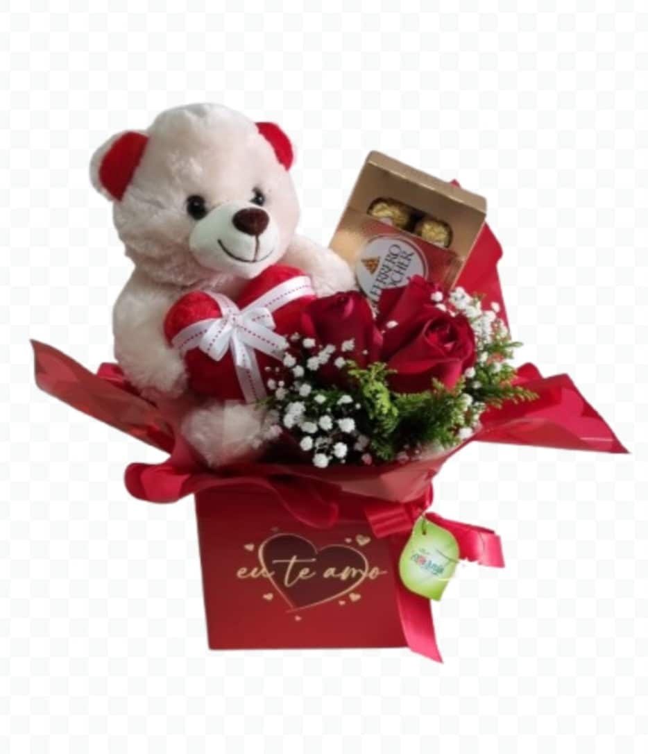 A – Caixa Amor com 03 rosas, chocolate Ferrero Rochet, Ursinho
