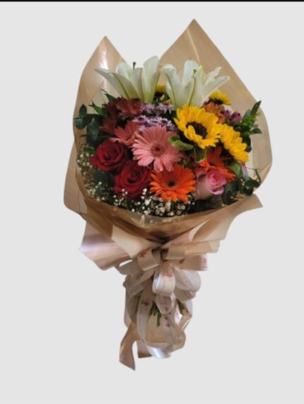 Composto por 12 rosas, embalado em EVA, laço com fitas variadas formando moderno e estiloso buquê.